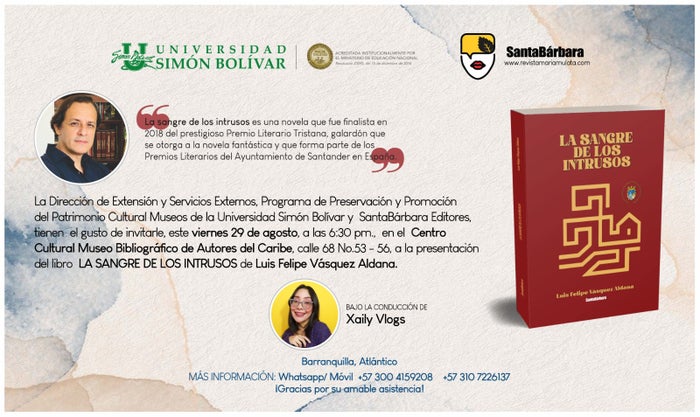 La Universidad Simón Bolívar, a través de la Dirección de Extensión y Servicios Externos, el Programa de Preservación y Promoción del Patrimonio Cultural y en alianza con SantaBárbara Editores, invita a la comunidad académica y cultural a la presentación del libro La sangre de los intrusos, del escritor colombiano Luis Felipe Vásquez Aldana.