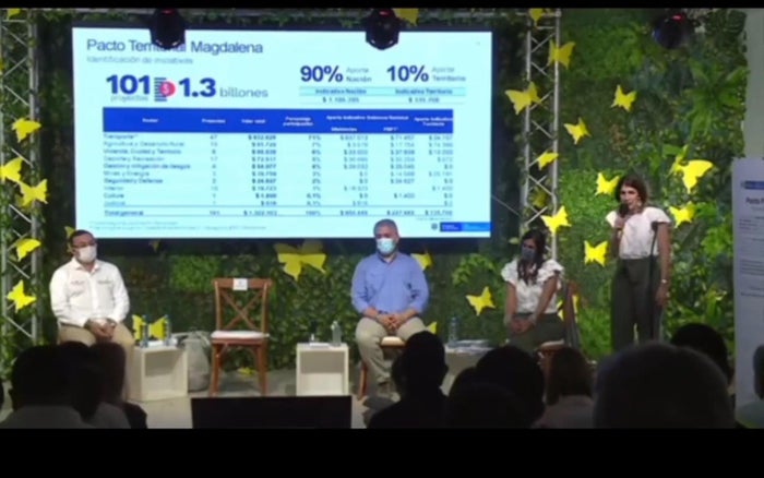 El presidente anunció la inversión de cerca de 1.3 billones de pesos para enfrentar la pobreza y reactivación de la economía en el departamento del Magdalena, el mandatario estuvo acompañado por la consejera para las regiones Ana María Palau y de Alejandra Botero Barco, directora del Departamento Nacional de Planeación, DNP.