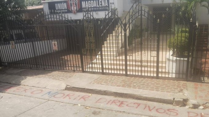 La sede administrativa del equipo de fútbol Unión Magdalena, amaneció con mensajes intimidantes en contra del cuerpo técnico y de los directivos como consecuencia por la mala campaña en la Liga colombiana.