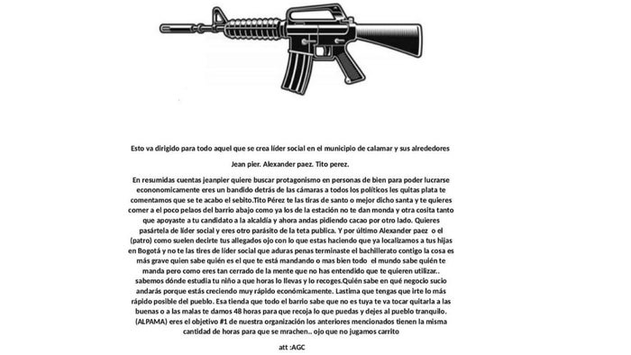 "Ojo con lo que estas haciendo que ya localizamos a tus hijas y no te las tires de líder social que a duras penas terminaste el bachillerato contigo la cosa es más grave quien sabe quién es el que te está mandando o mas bien todo el mundo sabe quién te manda pero como eres tan cerrado de la mente que no has entendido que te quieren utilizar, sabemos dónde estudia tu niño a que horas lo llevas y lo recoges", sentencia el panfleto.