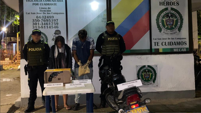 En una rápida acción, uniformados de la Policía Metropolitana de Cartagena lograron la captura de dos presuntos sicarios en el sur de la ciudad. Los detenidos, identificados como “El Carlitos”, de 22 años, y “Rosangela”, de 24 años, fueron interceptados mientras huían en una motocicleta tras, al parecer, atentar contra la vida de Rubén Manuel Reyes Núñez, un joven de 24 años, natural de Venezuela, en el barrio Villas de la Candelaria.