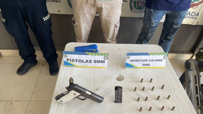 Las autoridades les incautaron un arma de fuego tipo pistola calibre 9mm, un proveedor y 14 cartuchos del mismo calibre.