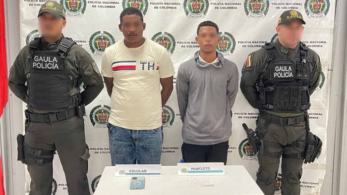 Los capturados en el operativo fueron identificados con los alias de ‘el Yasmer’, de 22 años, y ‘el Wil’, de 19 años. De acuerdo con el reporte oficial, las detenciones se produjeron en el momento en que estas personas realizaban la entrega de documentos con mensajes de grupos al margen de la ley a los propietarios de establecimientos de la zona.
