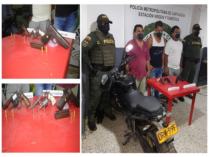 Policía Metropolitana de Cartagena Los tres presuntos bandidos fueron capturados en flagrancia, dos mototaxistas y un mensajero, incautándoles tres armas de fuego