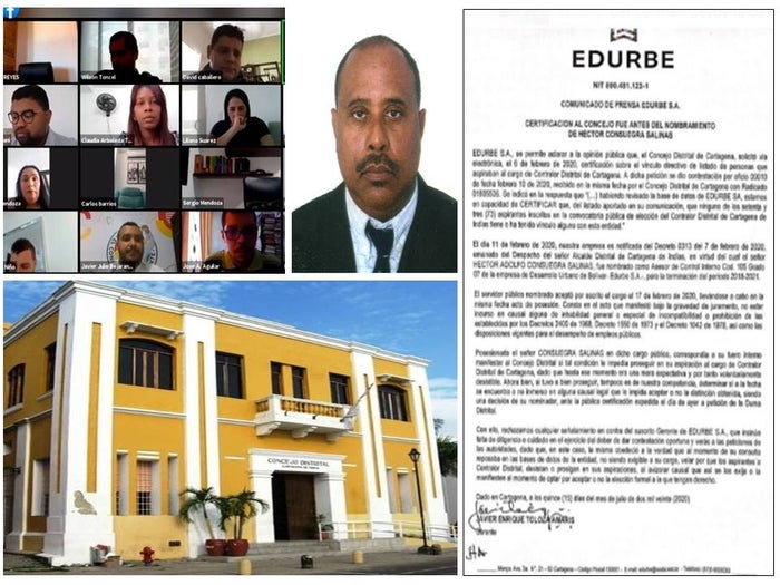 Ante el pronunciamiento que hizo la mesa directiva del Concejo de Cartagena el pasado 14 de julio, fecha en que fue elegido Héctor Consuegra como nuevo Contralor Distrital para el periodo 2020-2021, y que se abstendrá de posesionarlo ante una presunta inhabilidad por estar vinculado como asesor jurídico de Edurbe, entidad que según lo dicho por la corporación edilicia no habría informado sobre dicha vinculación.