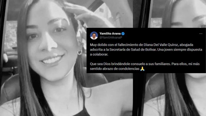 “Muy dolido con el fallecimiento de Diana Del Valle Quiroz, abogada adscrita a la Secretaría de Salud de Bolívar. Una joven siempre dispuesta a colaborar. Que sea Dios brindándole consuelo a sus familiares. Para ellos, mi más sentido abrazo de condolencias”.
