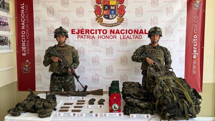 De acuerdo con el Ejército, en el lugar, las tropas incautaron un fusil, proveedores, munición, brazaletes alusivos a las Autodefensas Gaitanistas de Colombia (AGC), uniformes camuflados, equipos de campaña, hamacas y cintelas.