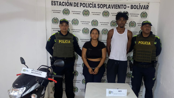 Por su parte, los dos capturados fueron identificados como Luis Alfredo Blanco Castellar de 23 años y Katerin Pinto Gutiérrez de 19 años, y junto con la motocicleta incautada como material probatorio, fueron dejados a disposición de la Fiscalía General de la Nación y un juez de la República que le dictó medida de aseguramiento en centro carcelario a Blanco Castellar.