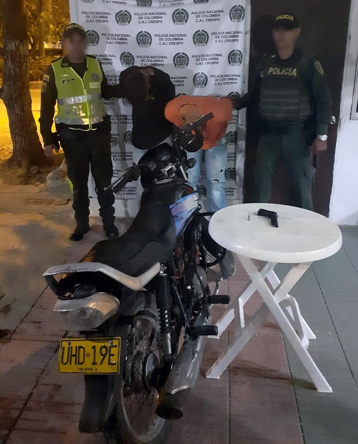 El par de hombres fueron sorprendidos cuando se movilizaban en una motocicleta, marca Auteco Bajaj, color negro, de placa UHD 19E, quienes eran seguidos de cerca por policías de la Estación Centro Histórico, que aguardaban a que los antisociales ingresaran al Túnel de Crespo, para ser acorralados, reducidos y capturados en flagrancia, al hallarle en su poder un arma de fuego, de fabricación hechiza, con un proyectil, calibre 38mm, que al parecer iban a ser utilizada por los presuntos delincuentes para cometer hurtos en esa zona de la ciudad de Cartagena de Indias.