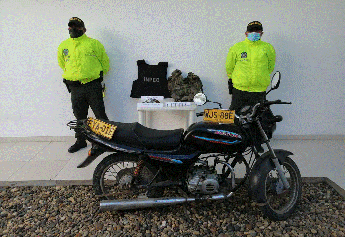Así mismo se habría hallado en la vivienda 4 cartuchos calibre 38 mm, un chaleco antibalas con las letras de INPEC, un chaleco arnés militar pixelado de uso privativo de las Fuerzas Militares, una placa para motocicleta WJS-88 E y se incautó la moto marca Auteco Bóxer, negra, de placa EYA- 01E.