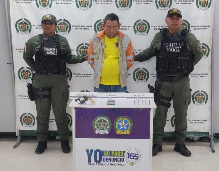 Al momento de su captura, los uniformados le realizaron una revisión personal y le hallaron en la pretina del pantalón un arma de fuego tipo revólver con 5 cartuchos 38 mm, sin la legalidad que demostrara su tenencia.