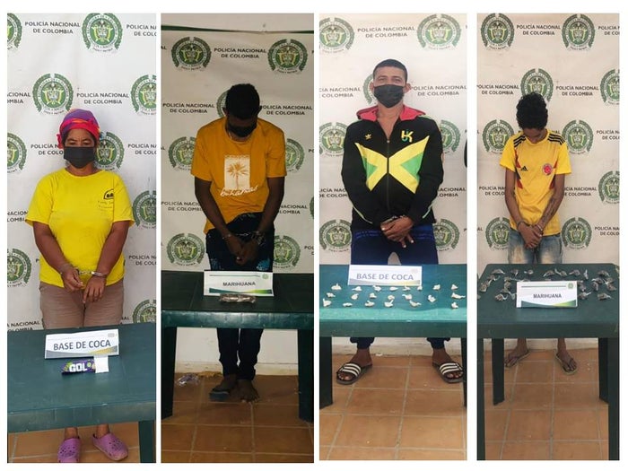 Los detenidos, a los que se les encontró en su poder 48.8 gramos de marihuana y 70.8 de base de coca; fueron identificados como Jesús Gutiérrez López, de 21 años, Brayan Fuentes Solarte, de 20 años de edad, Marina Gómez Nieves de 46 años y Jair Alberto Pontón Fonseca, de 30 años de edad. Este último presenta 3 anotaciones por los delitos de concierto para delinquir, tráfico y porte de estupefacientes e ilícito aprovechamiento de los recursos naturales.