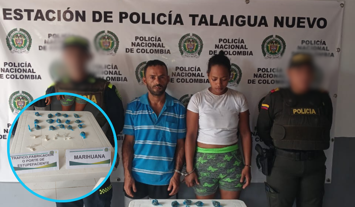 En las últimas horas, la estación de Policía de Talaigua Nuevo, en Bolívar, lograron capturar a dos personas, un hombre y una mujer, quienes luego de aceptar una revisión, les fue hallada en su poder marihuana y cocaína en los bolsos que ambos portaban.