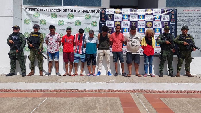 En Magangué, fueron capturados siete de ellos, entre los que se encuentran alias “Fauth”, presunto cabecilla de esta estructura y quien tiene anotaciones por hurto, tráfico, fabricación y porte de estupefacientes; alias “Jordi”, alias “Eloy”, alias “Tres Pelos”, alias “Peligro”, alias “Cuadrado” y alias “Vladimir”, este último tiene anotaciones judiciales por homicidio.