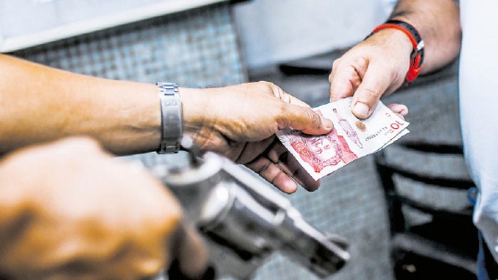 Arma y manos entregando billetes.