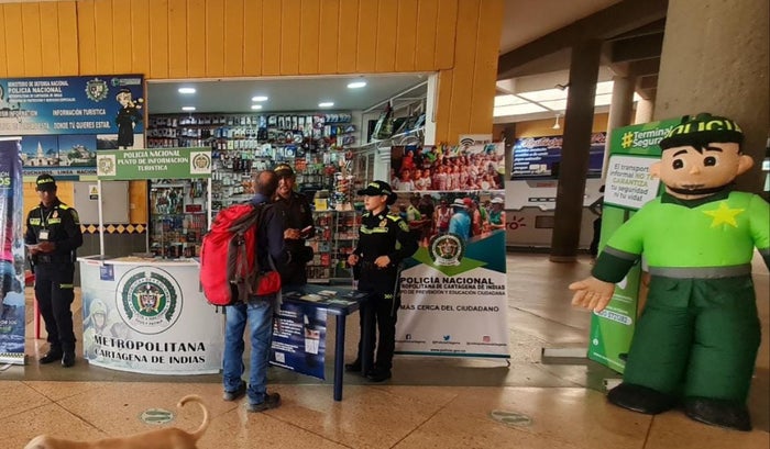 Desde la Terminal de Transportes de Cartagena, se adelantó una importante campaña preventiva denominada “Conéctate a la prevención 360 GAULA”, en coordinación con los grupos de Prevención y Educación Ciudadana, patrullas del Modelo Nacional de Vigilancia Comunitaria por Cuadrantes, Seccional de Inteligencia Policial y Seccional de Investigación Criminal e Interpol", señaló el mayor Julián Cañas jefe del Gaula - Mecar.