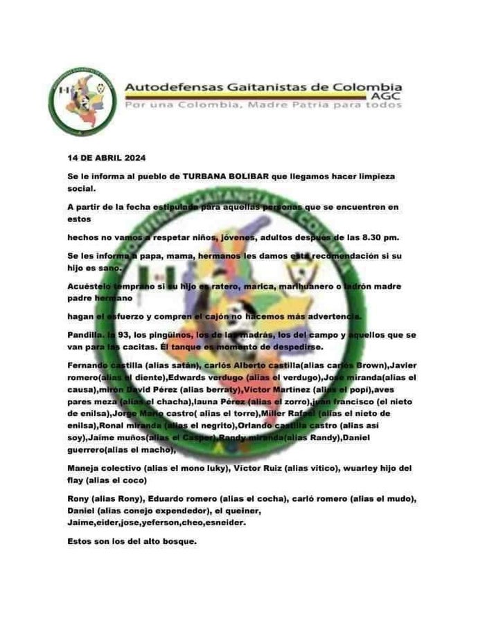 En dicha misiva con fecha del 14 de abril, se puede leer que el grupo estaría organizando una limpieza social en esta localidad. "Se le informa al pueblo de Turbaná, Bolívar, que llegamos a hacer limpieza social a partir de la fecha estipulada para aquellas personas que estén involucradas con estos hechos", indican.