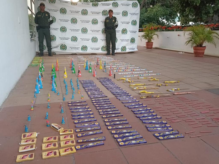 Indica la Policía que "En el proceso incautaron (100) cajas de chispitas mariposas, (50) volcanes grandes, (31) volcanes pequeños, (10) k0206, (70) bengalas, (25) Voladores, lo cual dio un peso de (20) kilos de pólvora, avaluados en más de $2’000.000 de pesos".