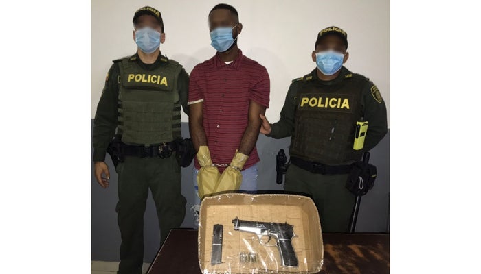 El hombre al notar la presencia policial intentó evadir a los uniformados, emprendiendo la huida pero no llegó muy lejos porque fue detenido. Informa la Institución armada que en el procedimiento se le halló en su poder una pistola calibre 9 milímetros de uso privativo de las Fuerzas Militares.