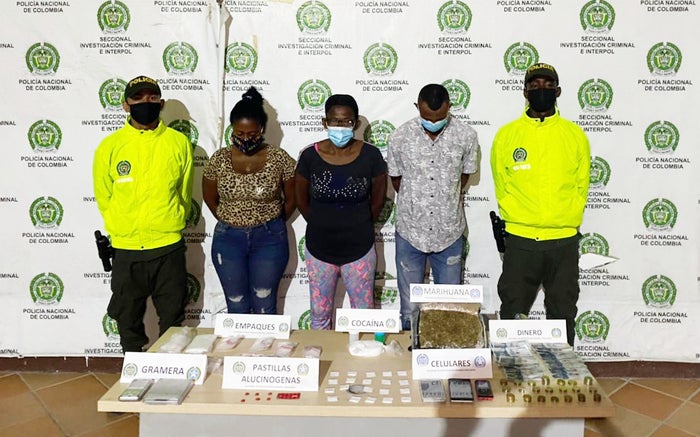 En el primer resultado operativo, en el barrio La Candelaria, nororiente de la ciudad, fueron capturados tres presuntos integrantes de la banda delincuencial “Los Jíbaros”, entre ellas su cabecilla, Eder Cano Calderón de 44 años, alias “Eder”, y dos mujeres: Eufemia Manuela Jiménez Torres, “Eufe”, de 55 años y Narly Consuegra Jiménez, “Narly”, de 34, quienes empleaban una vivienda como fachada para la distribución de estupefacientes, a escasos 20 metros de una institución educativa, incautándoles 500 dosis de cocaína, 26 pastillas sintéticas, una gramera, mil empaques plásticos para las dosis, y 30 mil pesos en efectivo.