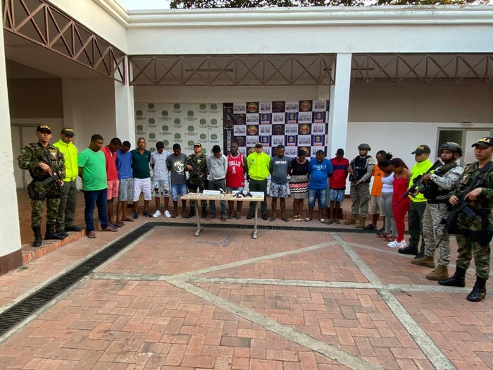 Los capturados fueron identificados como: “Emiro”, el cabecilla de la organización, “El Kurvera”, “El Mochón”, “El Menor”, “El Pitu”, “El Pol”, “Jonathan”, “La Seño”, “Carlitos”, “El Bola”, “Everlin”, “La Negra”, “El Yanki”, “Bonanza”, “Chucho”, “El Yupi” y “Eber”, quienes fueron puestos a disposición de la Fiscalía General de la Nación por los delitos de: Tráfico, fabricación o porte de estupefacientes y Concierto para delinquir. De acuerdo con las investigaciones, mediante otra diligencia de allanamiento y registro practicada en un colegio del barrio San Isidro, fueron incautadas cuatro kilos de marihuana que se encontraban ocultos al interior de unas cajas de cartón.