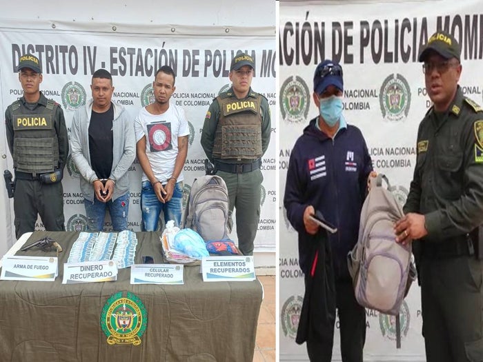 Desde el Departamento de Policía Bolívar se informa que "Después de un operativo que realizaron miembros de la Policía adscritos al IV Distrito en Bolívar con sede en Mompox, se logró la captura de dos sujetos, quienes al parecer minutos antes habrían atracado a un docente despojándolo de más de 100 mil pesos y un celular que llevaba en un bolso".