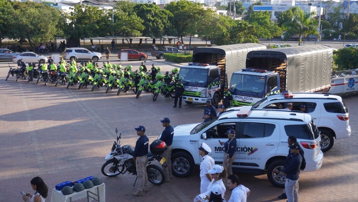 “Hoy anunciamos la entrega de 18 motos uniformadas y no uniformadas, junto a 2 camiones para la Policía Metropolitana. De igual forma, la Armada Nacional recibe de manos de la Secretaría del Interior y Distriseguridad 2 camiones y 4 camionetas. Además, dispusimos de 2 camionetas para la Unidad Administrativa Especial Migración Colombia”, dijo el alcalde de Cartagena, William Dau Chamat.