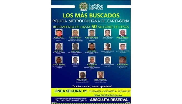 Con este cartel la Policía Metropolitana de Cartagena busca dar con el paradero de 17 personas por diferentes delitos, entre ellos el homicidio. Es así como la institución expresa que "Enfocados en el plan integral de innovación, transparencia y efectividad del servicio policial y en la lucha frontal contra los de delitos que afectan la Convivencia y Seguridad Ciudadana de los habitantes de Cartagena y los municipios de Turbaco, Turbana, Santa Rosa, Clemencia y Santa Catalina, damos a conocer ante la opinión pública el cartel de los 17 delincuentes más buscados por el delito de homicidio".