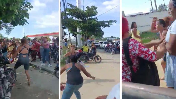 En medio de la confrontación una de las mujeres se observa que tiene en su mano derecha lo que se presume es un cuchillo, mientras que la otra agarra una silla plástica con la cual pretendía agredir a su rival; mientras otras damas intentaban mediar para que no se hicieran daño.