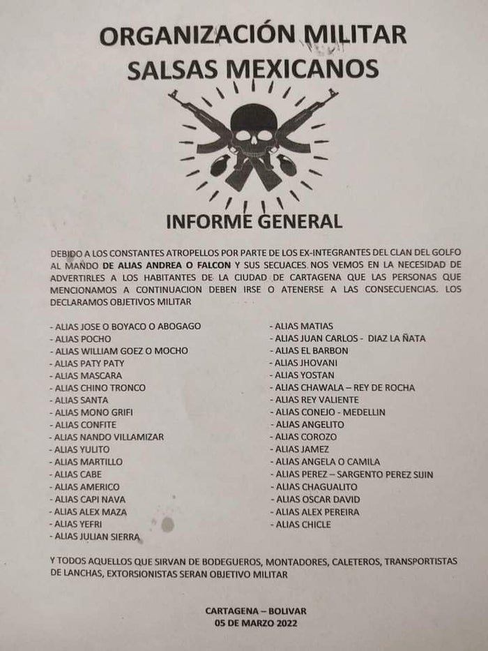 El documento expresa textualmente: “Debido a los constantes atropellos por parte de ex-integrantes del Clan del Golfo al mando de alias ‘Andrea o Falcón’, y sus secuaces, nos vemos en la necesidad de advertirles a los habitantes de la ciudad de Cartagena que las personas que mencionamos…deben irse o atenerse a las consecuencias, los declaramos objetivo militar”.