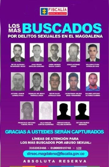 “El cartel es un documento elaborado en coordinación con las autoridades para abordar estos delitos sexuales que, lamentablemente, no reciben suficiente publicidad. Se trata de personas con órdenes de captura vigentes que aún no han sido detenidas”, explicó la Secretaría de la Mujer y Equidad de Género del Magdalena.