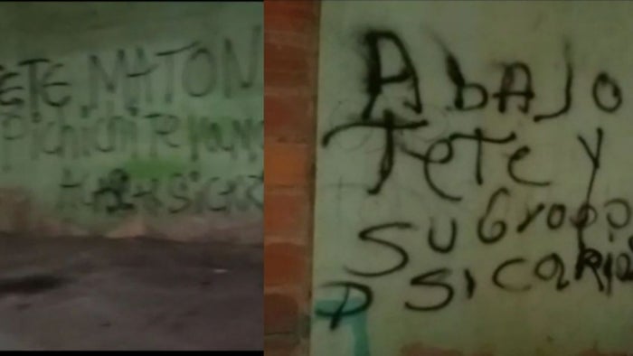En los mensajes intimidatorios que escribieron sobre las paredes, se pueden leer las siguientes amenazas; “nos vamos a vengar”, “Bladimir Tete y alias ‘Pichi’ son sicarios”, “abajo Tete y su grupo de sicarios”.