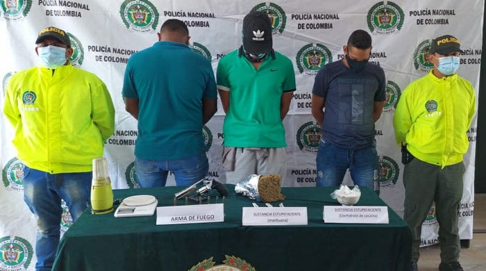 La acción judicial se desarrolló en el barrio 20 de Julio, logrando la captura de Frank García alias “Frank”, José María Fontanilla alias “Joche” y Justin Palacio alias “Justin”, a quienes se les fue incautada un arma de fuego tipo revolver calibre 38, 500 gramos de marihuana y cocaína dosificada.