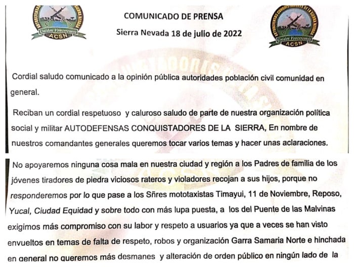 En el comunicado también hacen una advertencia a los mototaxistas de los barrios Timayui, 11 de Noviembre, Reposo, Yucal, Ciudad Equidad y sobre todo a los mototaxistas del puente de las Malvinas.