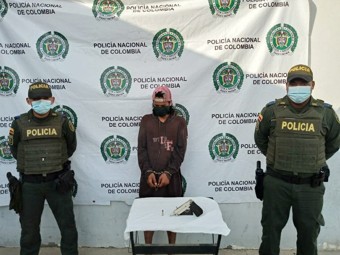 Una vez habiendo dado con las características del sospechoso, los policías abordan a una persona identificándola como Ovidio Miguel Orozco Buelvas a quien se le practicó una 'raqueteada' (un registro corporal) hallándole en su poder un arma de fuego artesanal color blanca con un cartucho 38 milímetros e incautándole igualmente 2 aires acondicionados anteriormente hurtados.