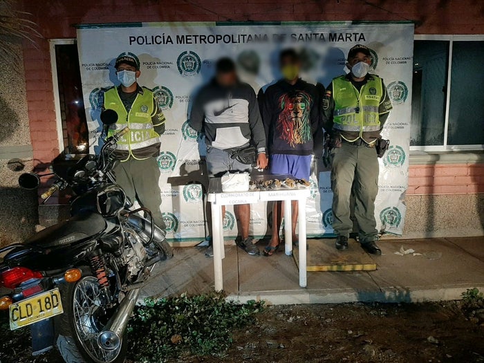 Dos personas fueron capturadas por las autoridades en la Troncal del Caribe, en operativos realizados por la Policia Metropolitana de Santa Marta con sus uniformados adscritos a la unidad de Transito y Transporte, quienes desarrollan bajo directrices nacionales el plan de choque nacional 'Construyendo Seguridad'. Estas personas fueron sorprendidas transportando estupefacientes en una motocicleta de color negro.