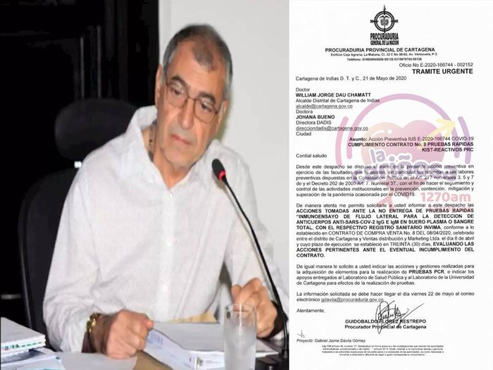 De acuerdo a la Procuraduría Provincial de Cartagena, el contrato en mención fue firmado el 8 de abril del presente año para tener una ejecución en treinta días. Así mismo, el órgano solicita informar sobre las acciones y gestiones realizadas por la alcaldía Mayor de Cartagena para la adquisición de elementos con el fin de realizar pruebas PCR, e indicar los apoyos entregados al Laboratorio de Salud Pública y La Universidad de Cartagena.