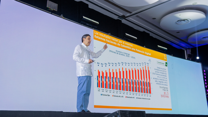 Cortesía: Cintel El ministro TIC, Mauricio Lizcano, durante el congreso ANDICOM 2024.