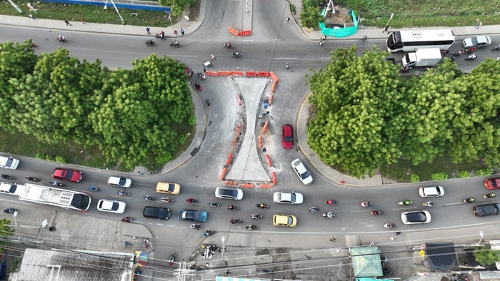 El Departamento Administrativo de Tránsito y Transporte, DATT, realizó en esta primera fase las perforaciones y el anclaje del acero de refuerzo para los bordillos reforzado, tanto el perímetro como en la zona central, del borde de la figura, continuando con la señalización del corbatín en la intersección de acceso a la Carolina y Villa Estrella.