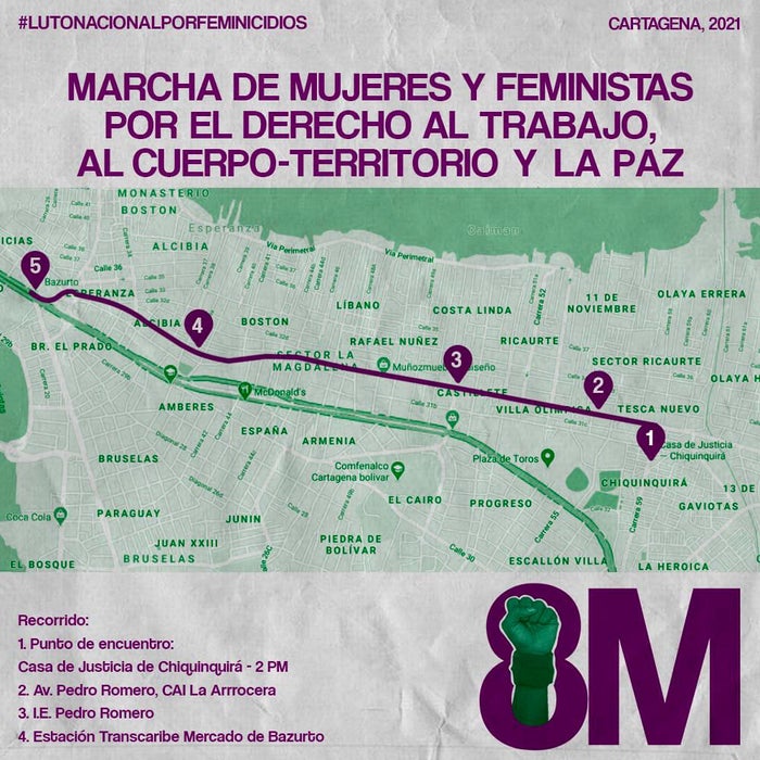 Paralelo a esto el Movimiento Social de Mujeres y feministas de Cartagena y el departamento de Bolívar, anunciaron que se tomarán las calles de la ciudad, este 8 de marzo, con una manifestación pacífica, que iniciará en la Casa de Justicia de Chiquinquirá, ubicada al suroriente de la ciudad.