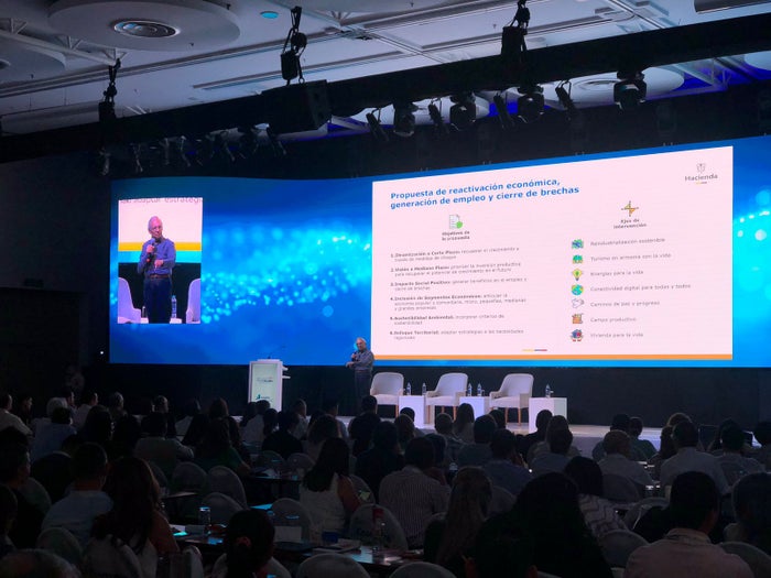 “La inflación llegó a una cumbre de 13,34% en marzo del 2023 y, al mismo tiempo el Banco de la República, comenzó a crecer las tasas de intervención. Pasó de menos de 2% a un máximo de 13,25%, también en marzo del 2023. Ahí la inflación y la tasa de intervención fueron más o menos iguales”, expresó el ministro al inicio de su intervención, en el Centro de convenciones Hotel Las Américas.
