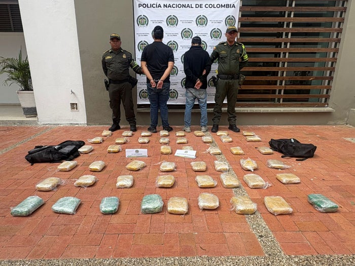 En la vía nacional San Onofre-Cartagena, la Policía Nacional de Colombia en el departamento de Bolívar dio con dos hombres que llevaban en dos morrales 49 paquetes de marihuana prensada. Los sujetos intentaron persuadir a los policías que descubrieron lo que llevaban, pero fueron detenidos de inmediato.