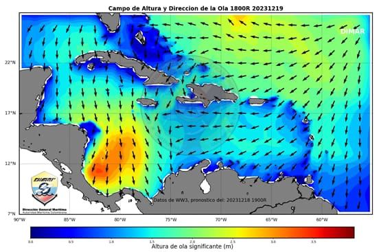 Por otro lado, en el este del Caribe se observa el flujo de vientos alisios de componente predominante este y noreste, con velocidades máximas entre 10 y 17 nudos (18.5 y 31.4 km/h) y una altura de ola significativa que oscila entre 1 y 2 metros.