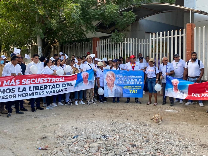 Familiares, allegados y cuerpo académico de la Institución Educativa Camilo Torres, en el barrio El Pozón, realizan una concentración desde muy temprano que espera movilizarse hacia la Gobernación de Bolívar, para pedirle a las autoridades resultados con relación a la búsqueda del profesor Hermides Vásquez, desaparecido hace algunas semanas en zona rural del municipio de Clemencia, Bolívar.