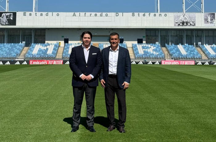 Cortesía Director para América de la Fundación Real Madrid, Mateo Figueroa, junto al alcalde de Cartagena, Dumek Turbay en el estadio Alfredo Di Stéfano de Madrid.