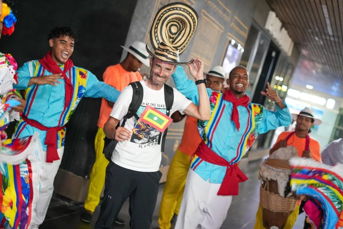 Valverde, campeón del mundo en 2018 y ganador de la Vuelta a España 2009, arribó al Aeropuerto Internacional Rafael Núñez, donde fue recibido por el director del Instituto de Deporte y Recreación (IDER), Campo Elías Teherán, y representantes de Corpoturismo, acompañado de una muestra de danza tradicional del Instituto de Patrimonio y Cultura de Cartagena (IPCC).