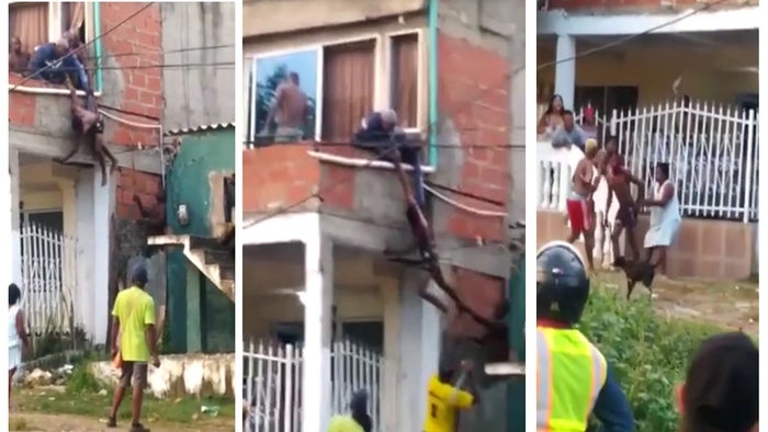 A ratero 'salao' lo bajan a punta de palo de un segundo piso