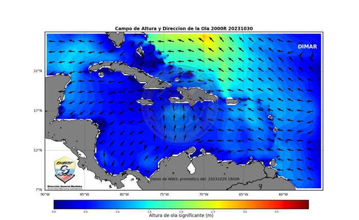 De acuerdo con el Centro de Investigaciones Oceanográficas e Hidrográficas del Caribe (CIOH), se observa una altura de la ola que oscila entre 1.0 y 1.5 metros sin ninguna afectación al territorio nacional por la vaguada que se encuentra en el este del Mar Caribe. Para las próximas 48 horas la tendencia no indica mayor afectación de este sistema para el territorio marítimo nacional.