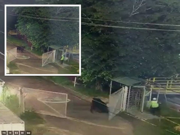 Un vídeo muestra el momento justo cuando el búfalo o toro embistió de forma violenta un portón de hierro, lo que hizo correr a dos vigilantes, uno de ellos más lejos del lugar, mientas que el otro tuvo que esconderse y protegerse del animal a un lado del portón donde está una garita de vigilancia.