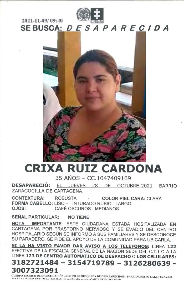 Crixa Ruiz Cardona, de 35 años, es la mujer que las autoridades en Cartagena y una familia Bogotana buscan desde el pasado miércoles 27 de octubre, cuando notificaron en el Hospital Universitario del Caribe de su escape.